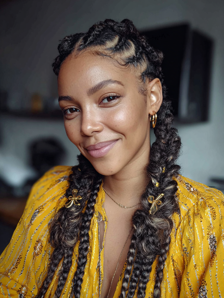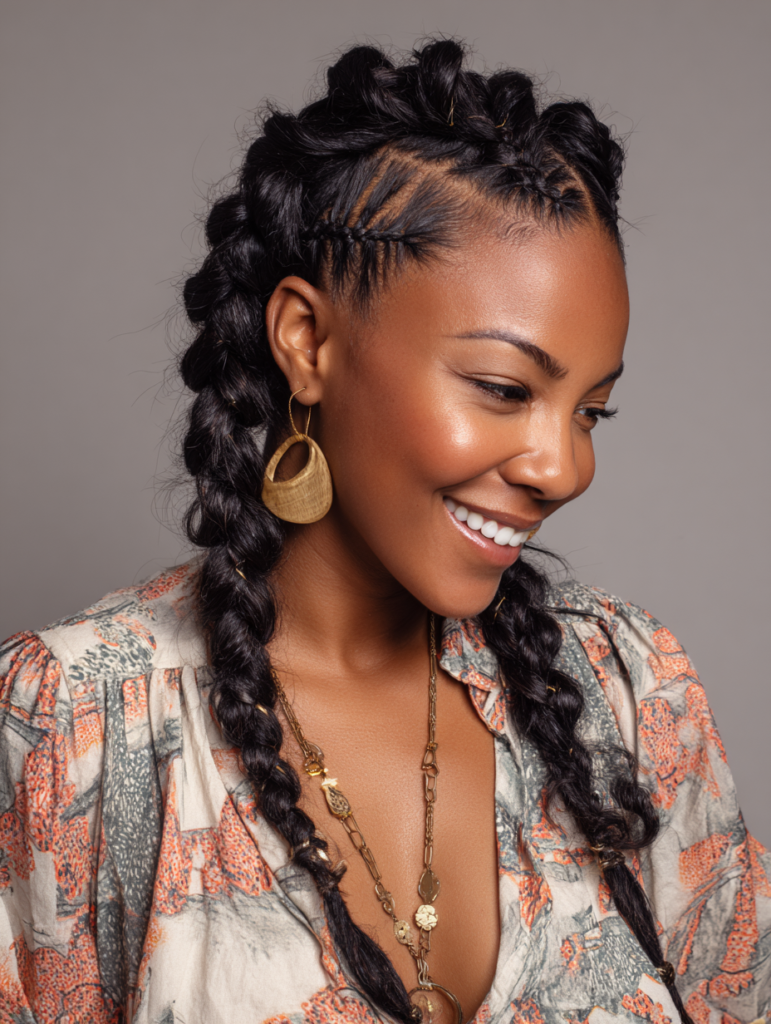 Goddess braids use larger sections, which reduces tension on the scalp. They suit fuller face shapes and thicker hair textures well. This style feels comfortable and looks polished without complexity.