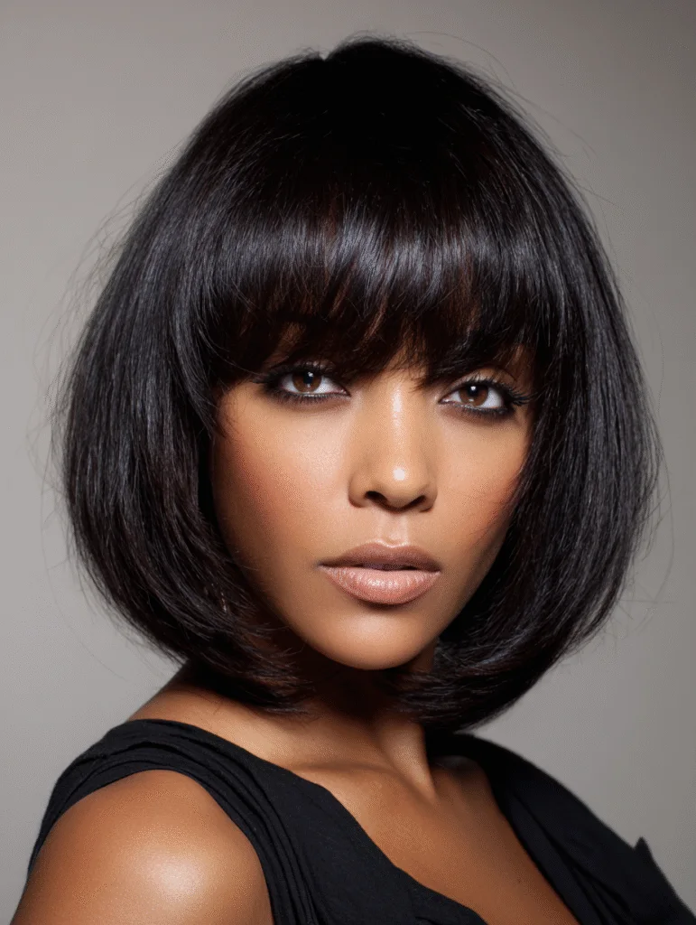 A quick weave with voluminous bangs creates a bold front shape while keeping the rest of the hair sleek and controlled. The stylist installs the bangs with enough lift to make them frame the eyes without feeling heavy.