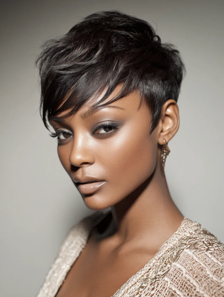 This short pixie quick weave delivers a clean, cropped shape with sharp lines and soft feathered layers. Your stylist molds the base carefully, making the tracks lie flat while still giving enough movement at the top.