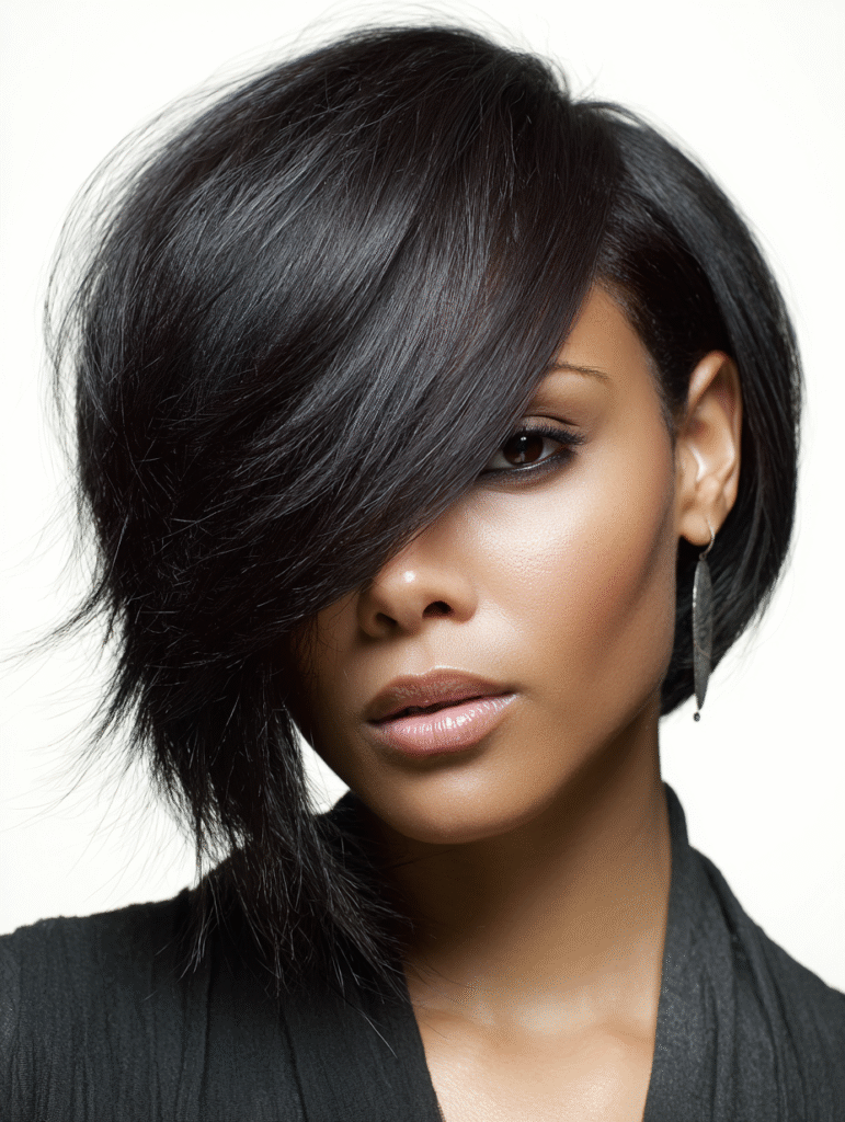 An asymmetrical quick weave bob gives you a sharp, modern shape with one side longer than the other. The stylist cuts the hair carefully to maintain balance, making the shorter side hug the jaw while the longer side drops smoothly toward the shoulder.