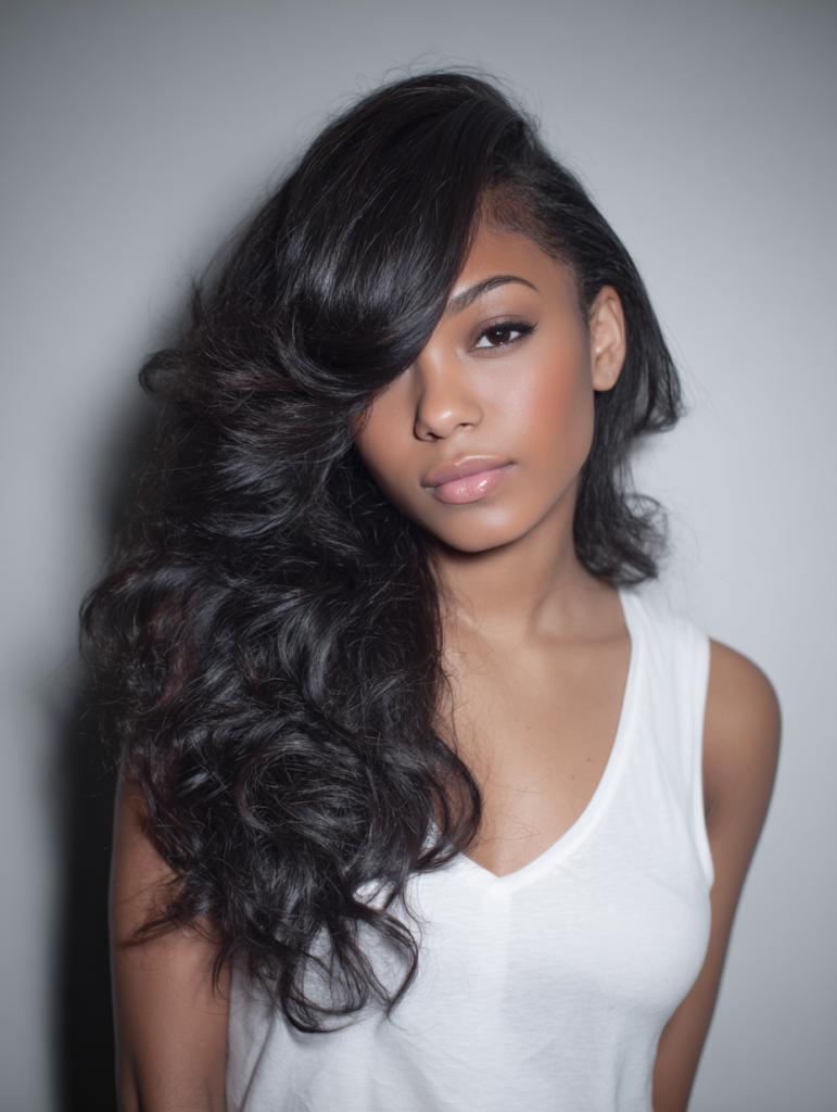 A layered side part sew in adds movement and volume, making it great for women who want softness around the cheeks. The deep part enhances facial symmetry and highlights cheekbones, working especially well for round or square faces. Body wave or loose wave textures blend easily.
