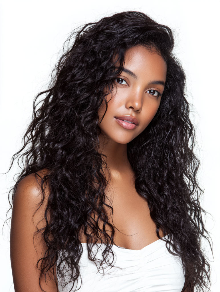 A deep wave sew in delivers bold texture and striking dimension. The wave pattern suits women who enjoy hair with movement and noticeable curl definition. It complements oval, long, and heart-shaped faces by adding horizontal volume.