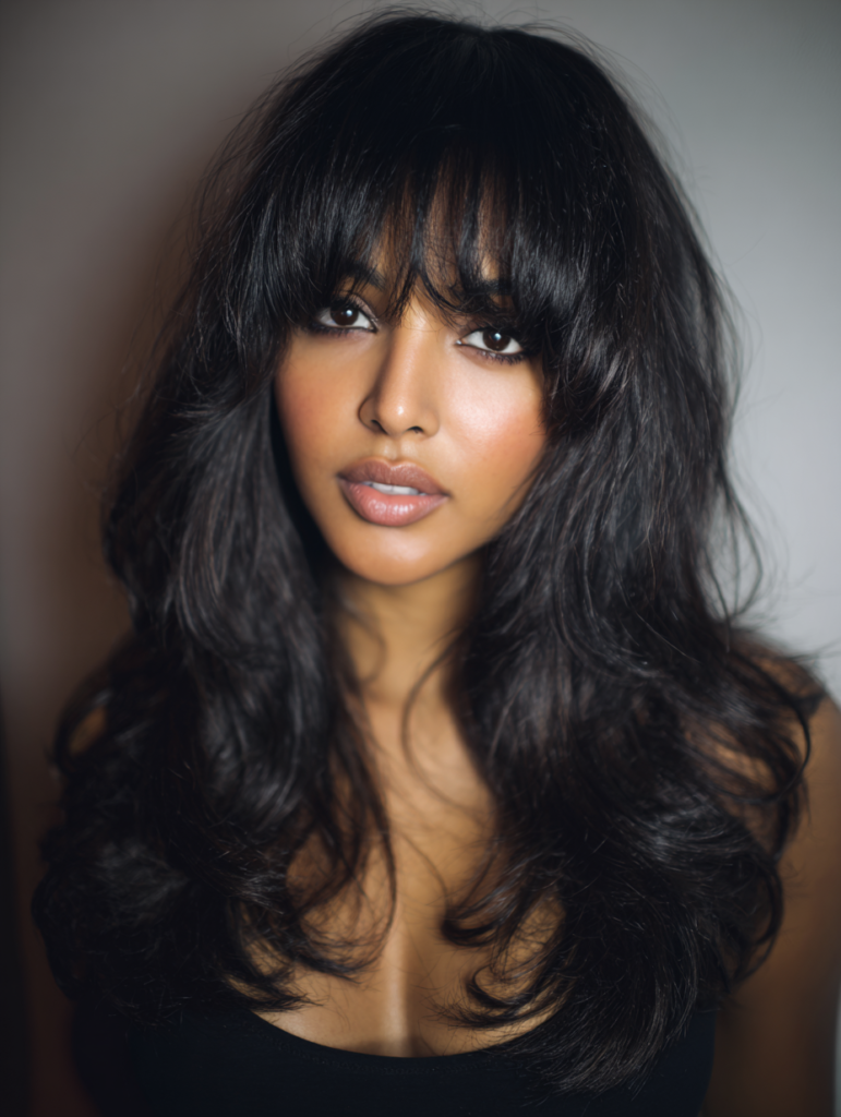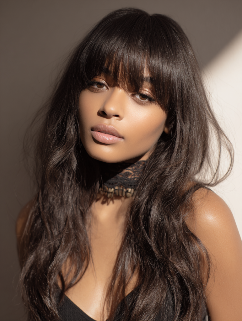 A sew in with bangs softens features and creates a fresh, face-framing effect. It works well for women with longer foreheads or those wanting extra dimension around the eyes. Straight or loose curled textures pair beautifully with this cut.