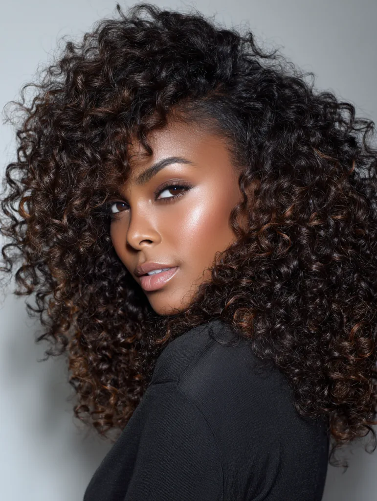 A curly sew in with leave out blends natural curls with extension curls for seamless definition. It suits women with medium to tight curl patterns who want added fullness. This style keeps your natural texture visible while still reducing daily manipulation.