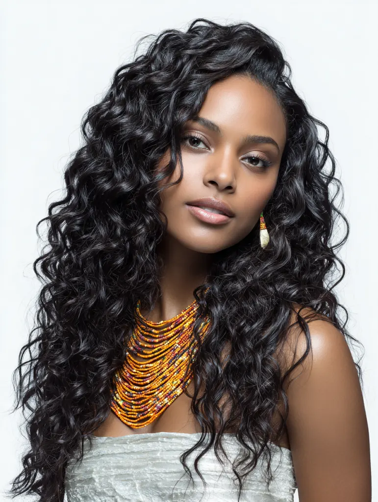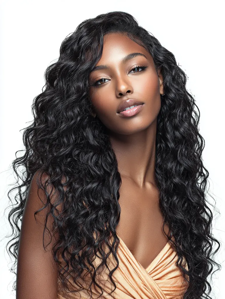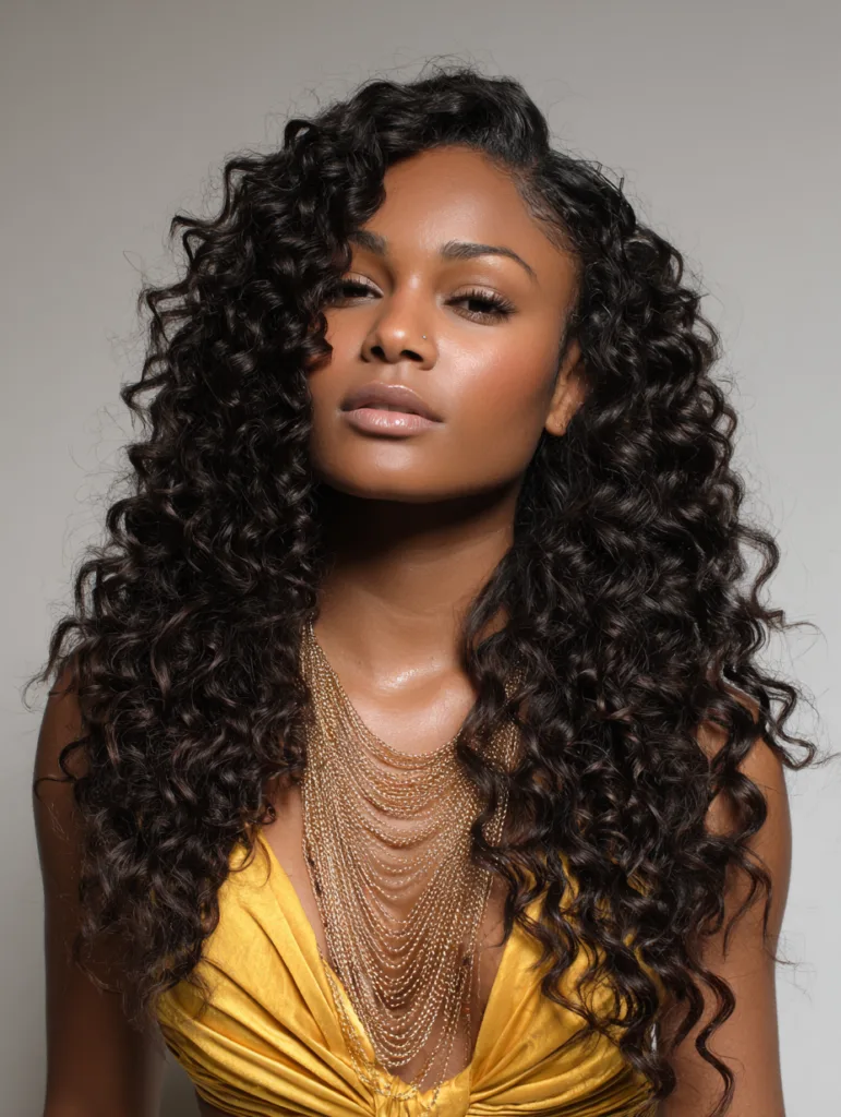 A deep wave sew in delivers bold texture and striking dimension. The wave pattern suits women who enjoy hair with movement and noticeable curl definition. It complements oval, long, and heart-shaped faces by adding horizontal volume.