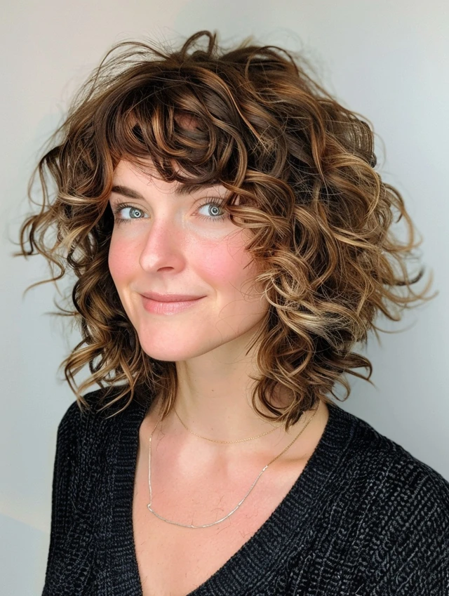 A curly shaggy lob embraces natural curls with layered ends for bounce and volume. Works for oval and heart-shaped faces, softening features while defining curls. Fine curls appear denser; thick curls gain shape.