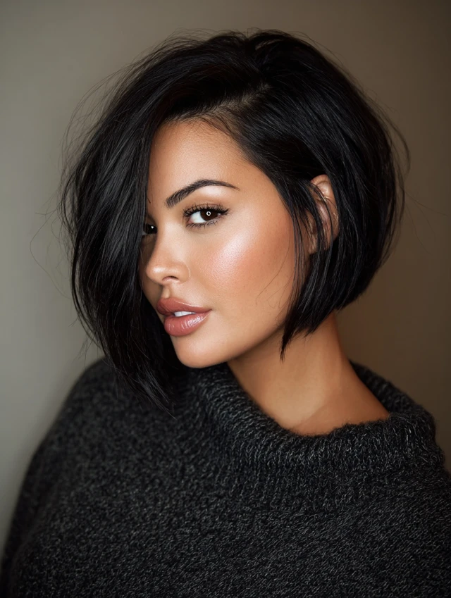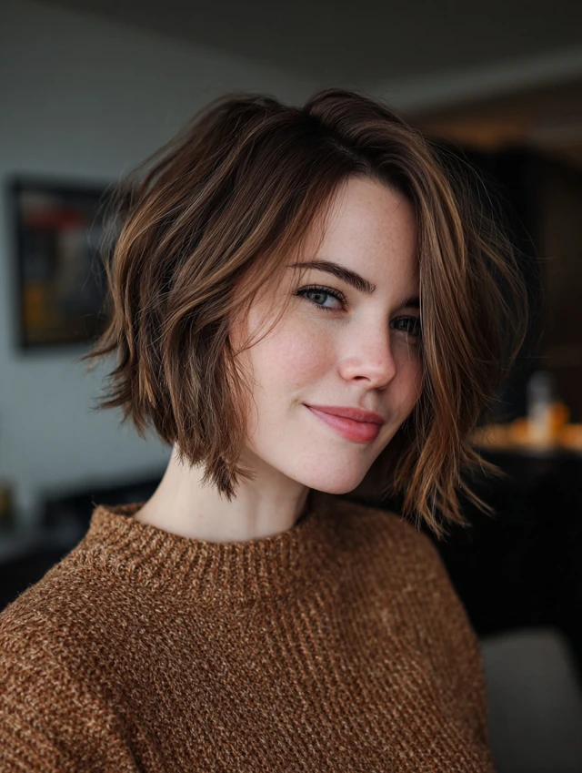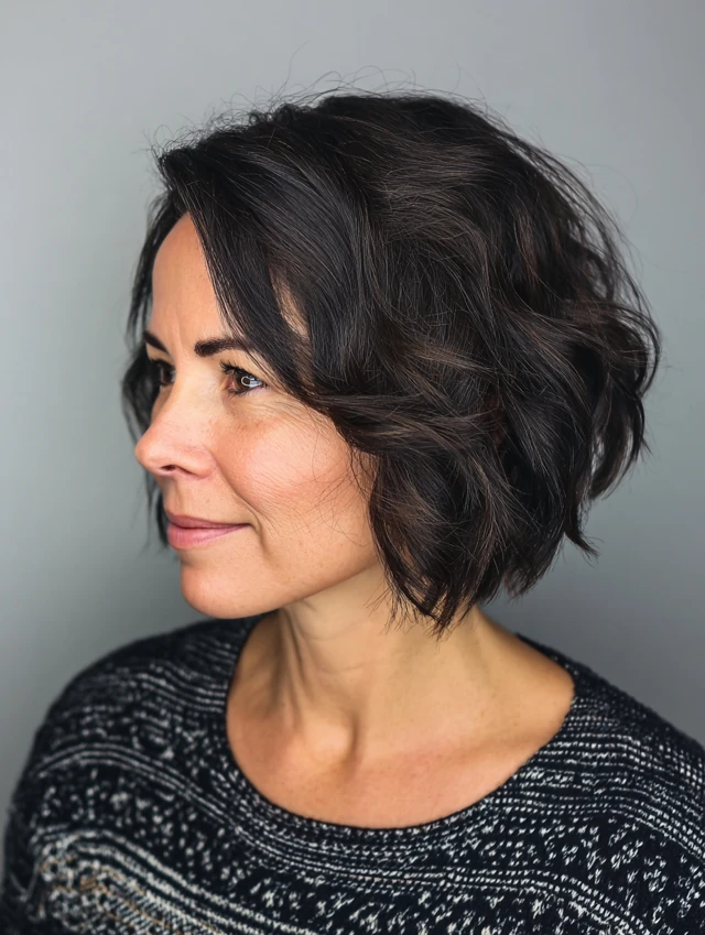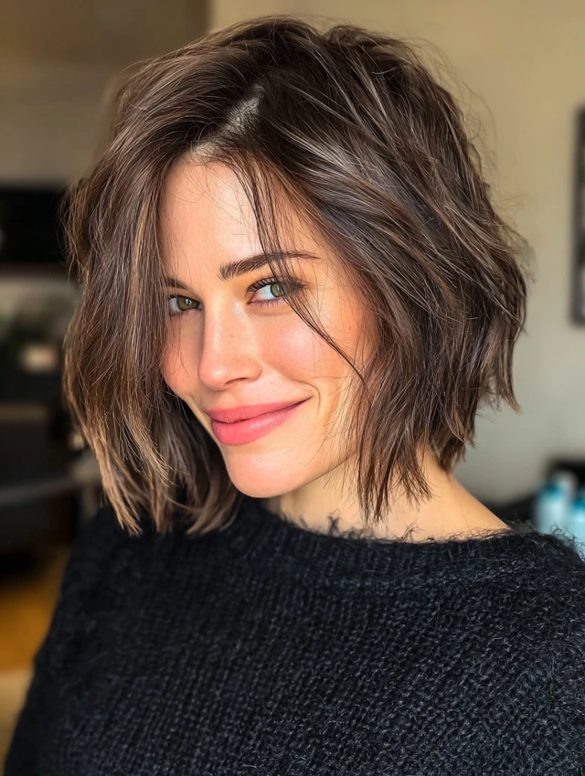 A textured bob that hits at the jawline creates structure. A deep side part adds diagonal lines that slim the face visually. This style flatters round and square faces by breaking up width. Thick hair benefits from internal layers that remove bulk.