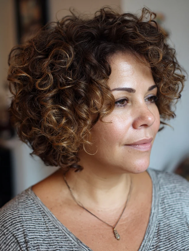 Curly hair shines in a layered short cut. The layers distribute volume evenly and prevent a wide silhouette. This style flatters round and square faces by softening features. Shoulder-grazing or slightly shorter lengths keep curls defined.