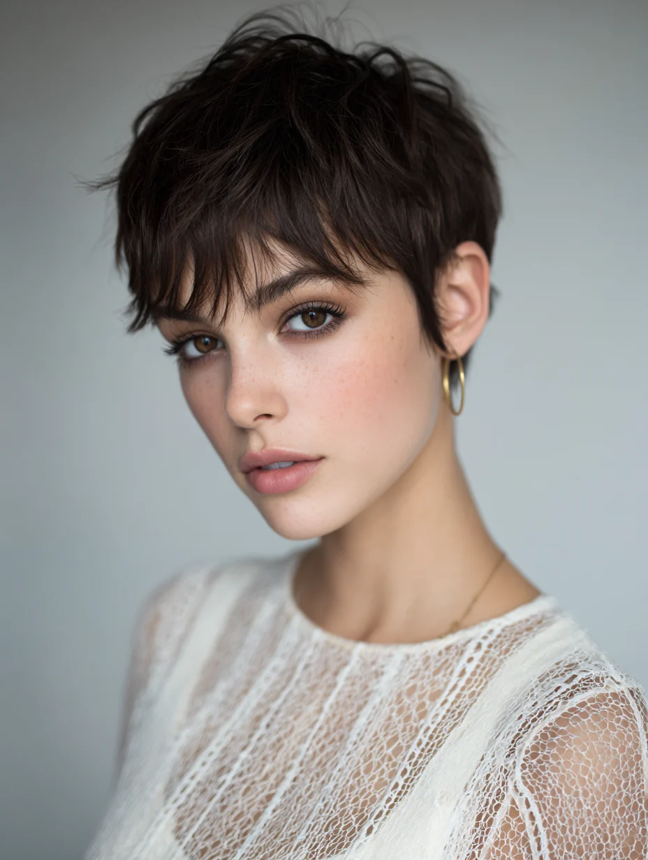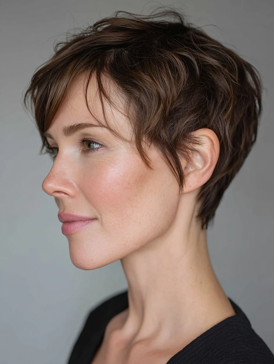 This pixie uses light texture on top to create lift without thinning the ends too much. It suits oval, heart, and smaller round faces because height balances softer features. Fine straight hair responds well to this shape since it does not rely on heavy layers. Daily styling stays simple, often just a light cream or paste.