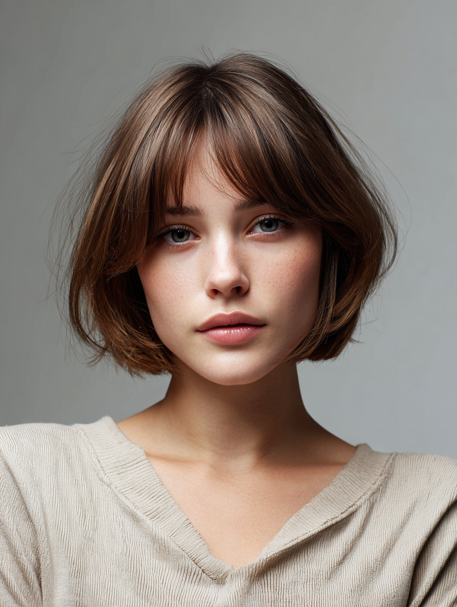 A short blunt bob creates instant density by keeping the ends one strong length. Fine hair looks thicker when the perimeter stays solid instead of feathered. This style works well for straight hair and elongated or oval face shapes. It draws attention to clean lines and sharp detail.