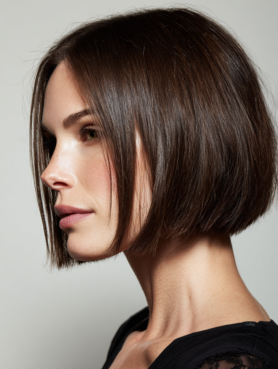 Styling stays straightforward and predictable, which many people prefer. A flat iron or smooth blow dry enhances the shape without extra steps. Maintenance involves regular trims, but daily effort stays low. This cut works best when you want a bold, clean look that does not rely on volume tricks.