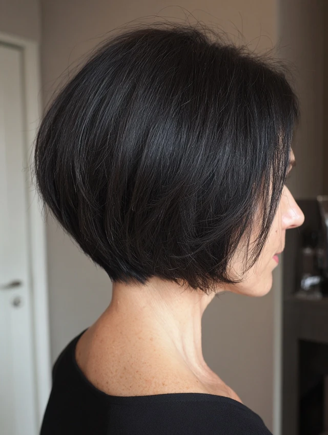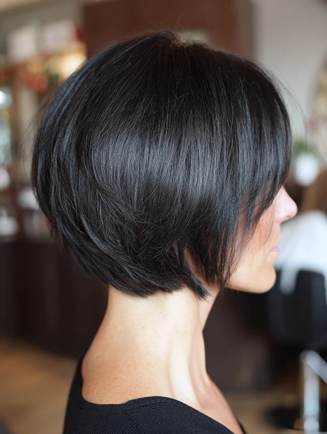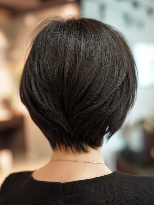 Micro bangs add edge and personality. They suit oval and petite face shapes best. The stacked layers at the back create height and fullness. Thick or straight hair showcases this structure clearly.