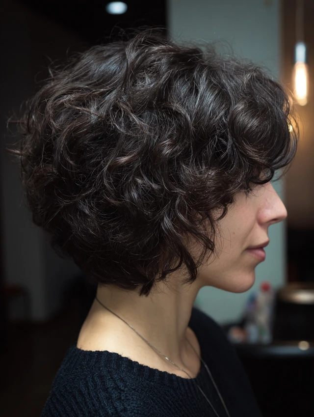 Curly hair adds bounce to this shape. The layers prevent the bob from looking triangular. Bangs can be slightly longer and curly to blend naturally. This style flatters oval and square faces by softening angles.