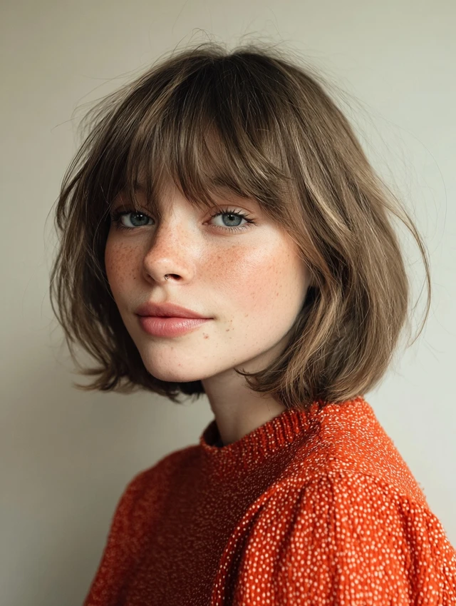 Wispy bangs make the cut feel relaxed. This version suits heart-shaped and oval faces because it balances the forehead and chin. The layered structure adds messy volume. Medium to thick hair holds texture best and shows off movement.