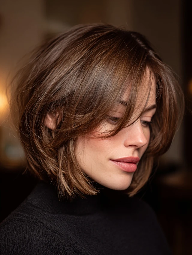 Side-swept bangs soften the look and add movement. They flatter round and square faces by creating diagonal lines. The layered bob keeps the shape light and prevents heaviness near the jawline. Straight and slightly wavy hair types style this version easily.
