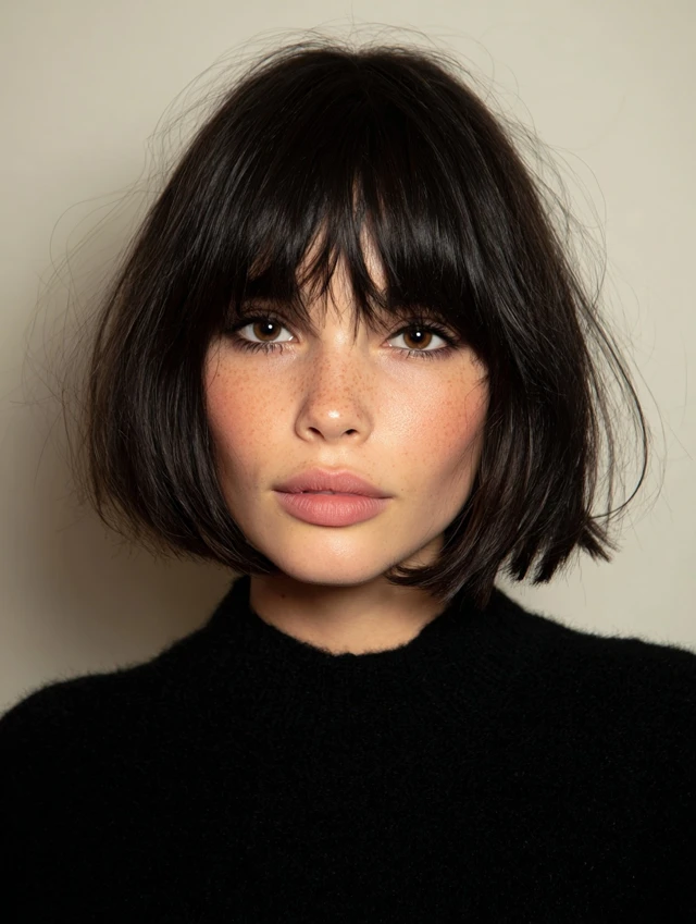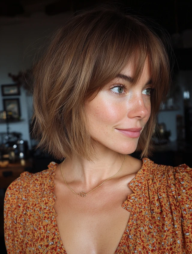 The short layered bob with bangs offers structure without feeling stiff. It frames the face and adds built-in movement. You can keep it sleek or let it stay textured and relaxed. That flexibility makes it a strong everyday choice.