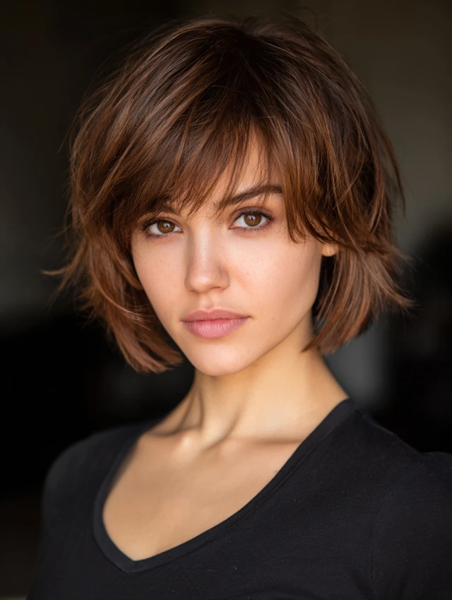 Layers remove weight and create natural volume. That helps fine hair look fuller and thick hair feel lighter. The short length keeps the shape strong and defined. Bangs break up the forehead area and add balance to longer or wider face shapes.