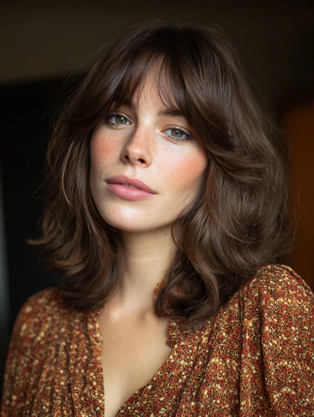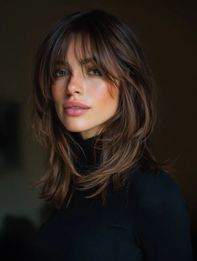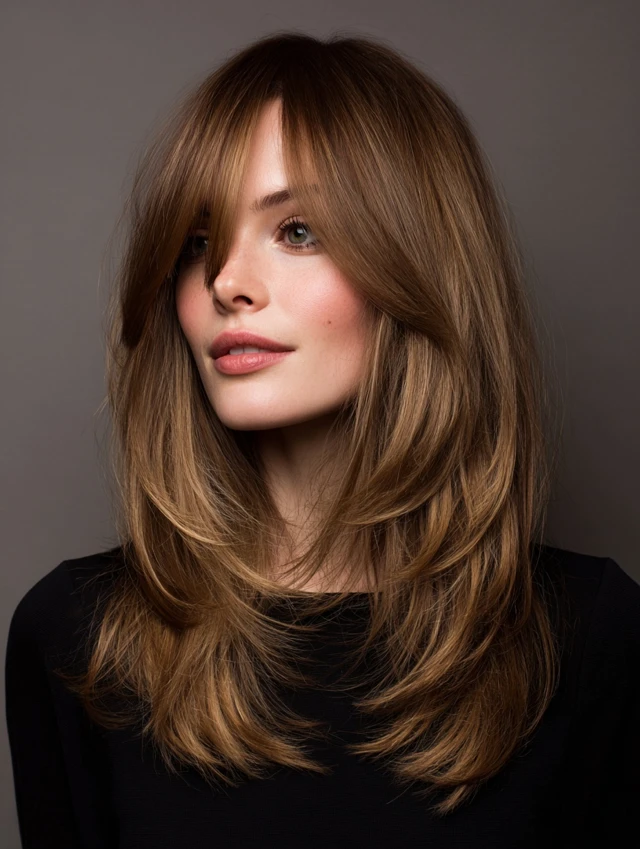 Curtain bangs frame the face and blend into the layers. This style works for round and heart-shaped faces because it softens the forehead area. Medium to thick hair holds the curtain shape best. The layered cut prevents heaviness.