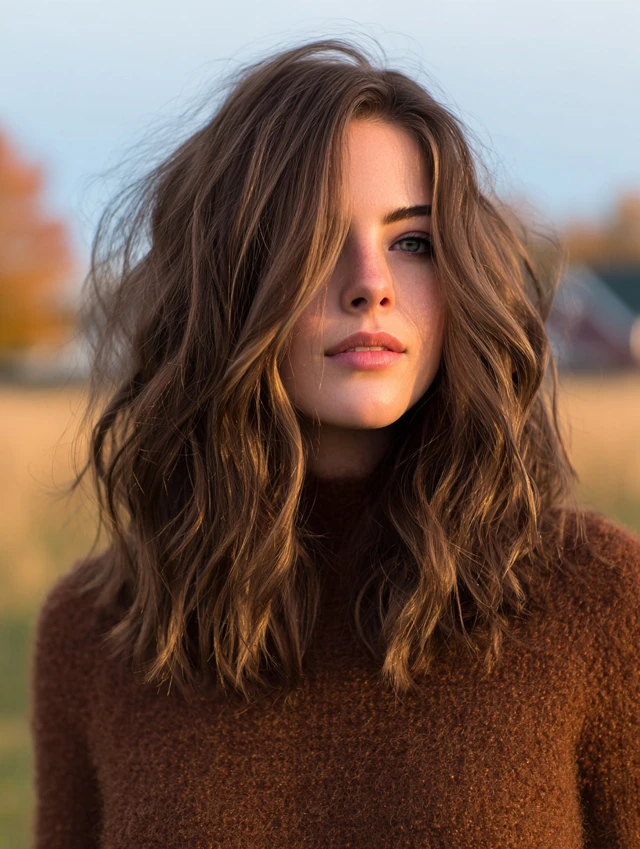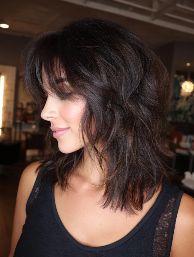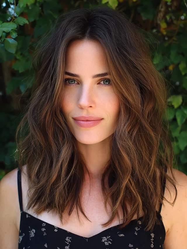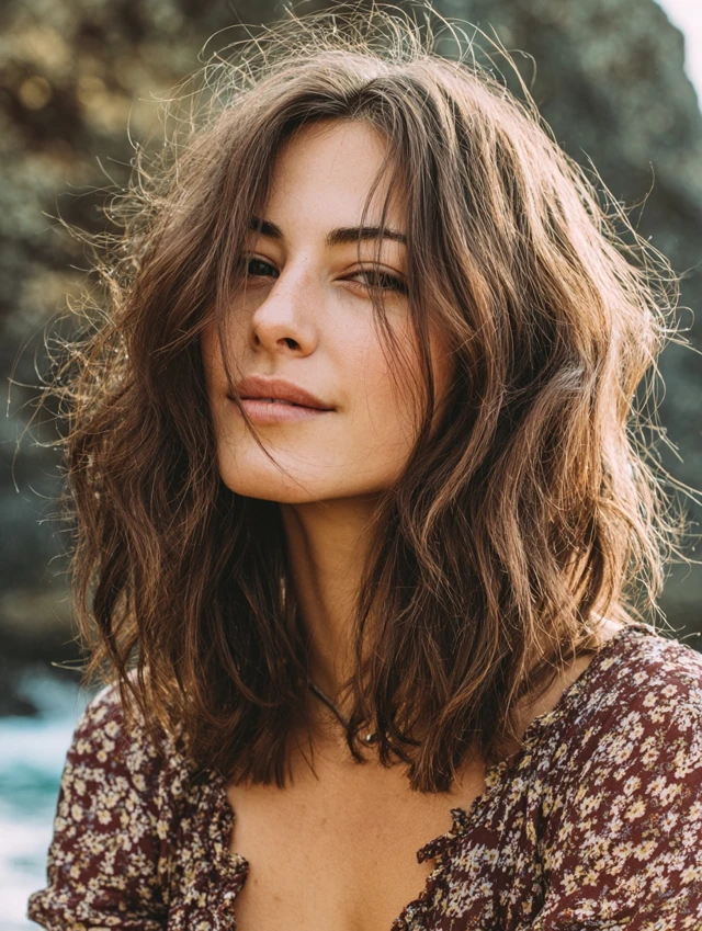 Natural waves shine in this layered cut. It suits oval and round faces because the movement adds dimension. Medium to thick hair shows off texture best. Layers prevent waves from looking bulky at the ends.