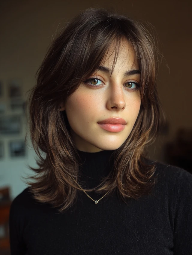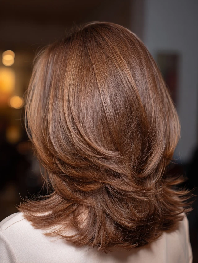 Feathered layers create light movement around the face. This version flatters oval and heart-shaped faces because it highlights cheekbones. Fine to medium hair benefits most since feathering adds softness without removing too much density. The shoulder length keeps the style full.