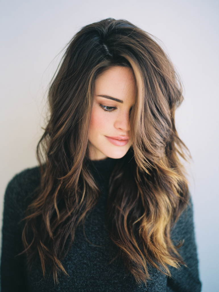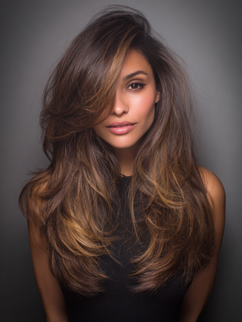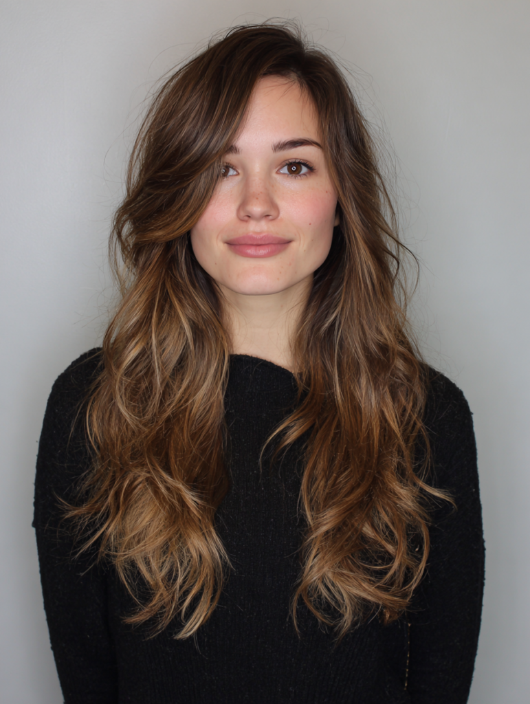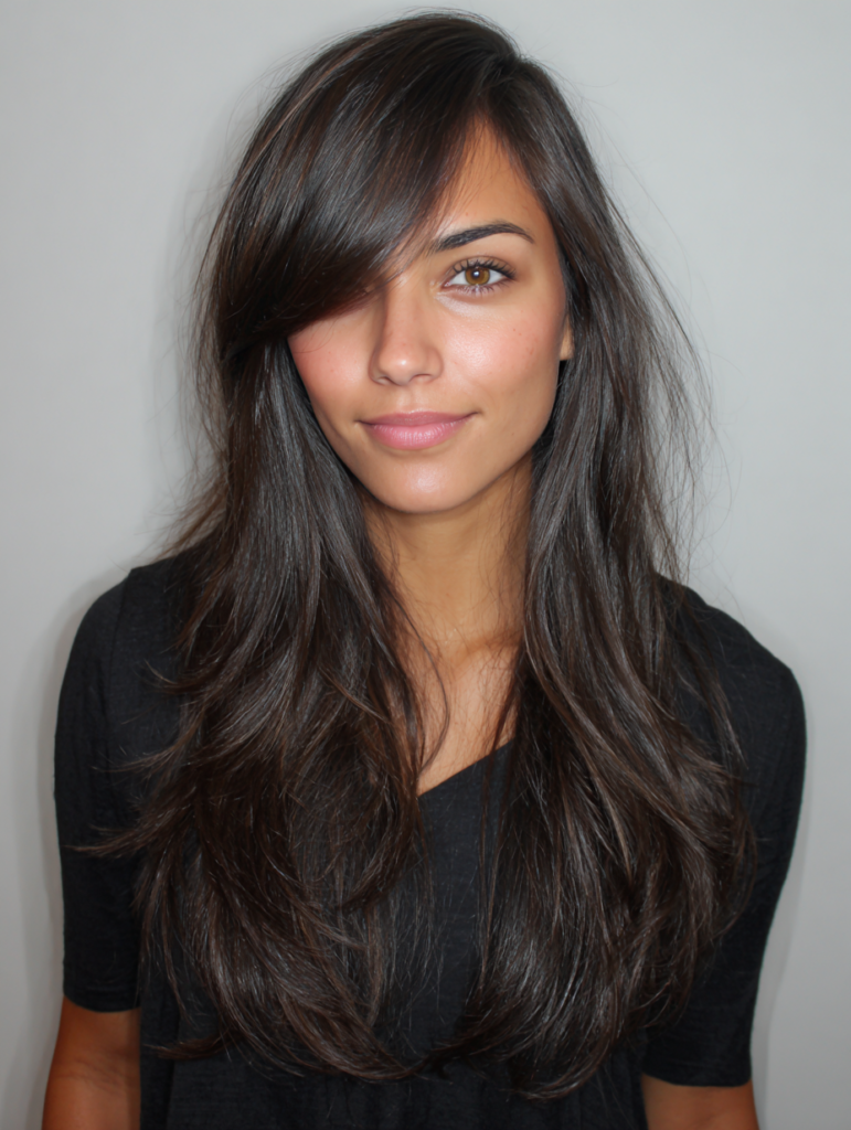 Side part long layers work well for someone who wants movement without losing length. The part shifts the top layers toward one side, which builds bounce and soft height at the crown. This style flatters oval, heart, and long face shapes because the layers break up vertical length. Medium and thick textures benefit most from the added flow and controlled volume.