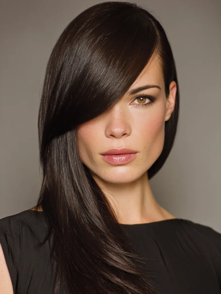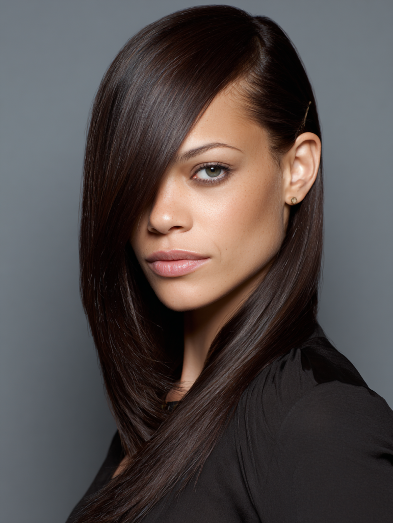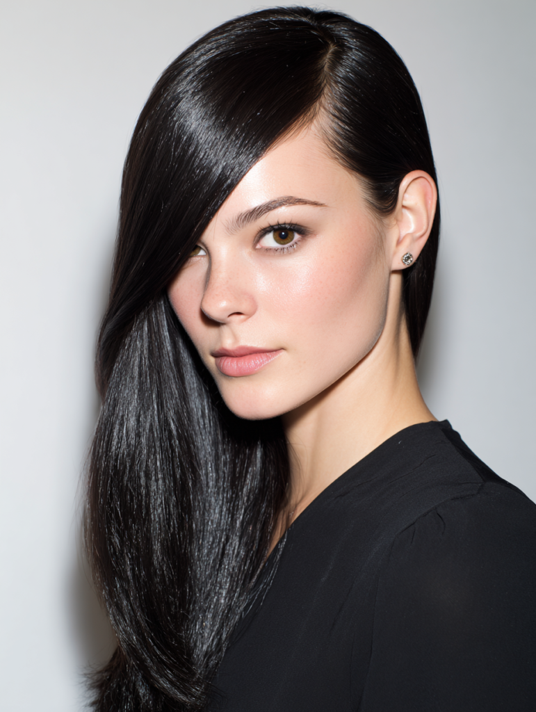 Use a flat iron to smooth the lengths and finish with a lightweight serum to control flyaways. Keep the part crisp for a cleaner effect. This style requires minimal upkeep once set, making it a good choice for anyone who prefers quick styling with a polished outcome.