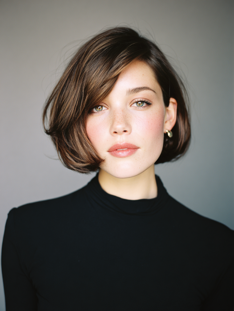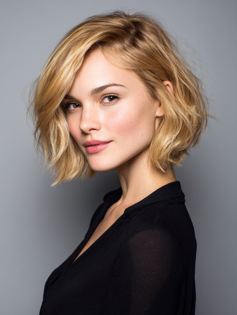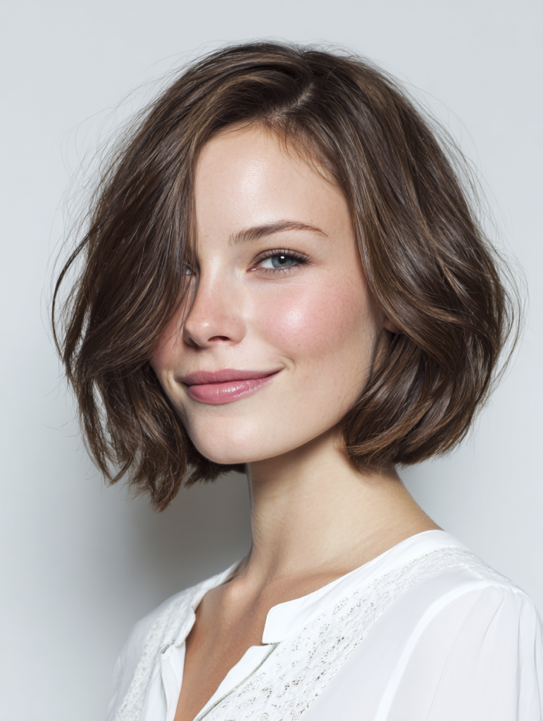 The side part bob adds movement and shape to a classic haircut. It directs the front pieces toward the face, which creates a soft frame around the cheeks. This placement benefits someone with an oval, square, or round face because the angle helps balance proportions. The bob works well with straight, wavy, or fine textures.