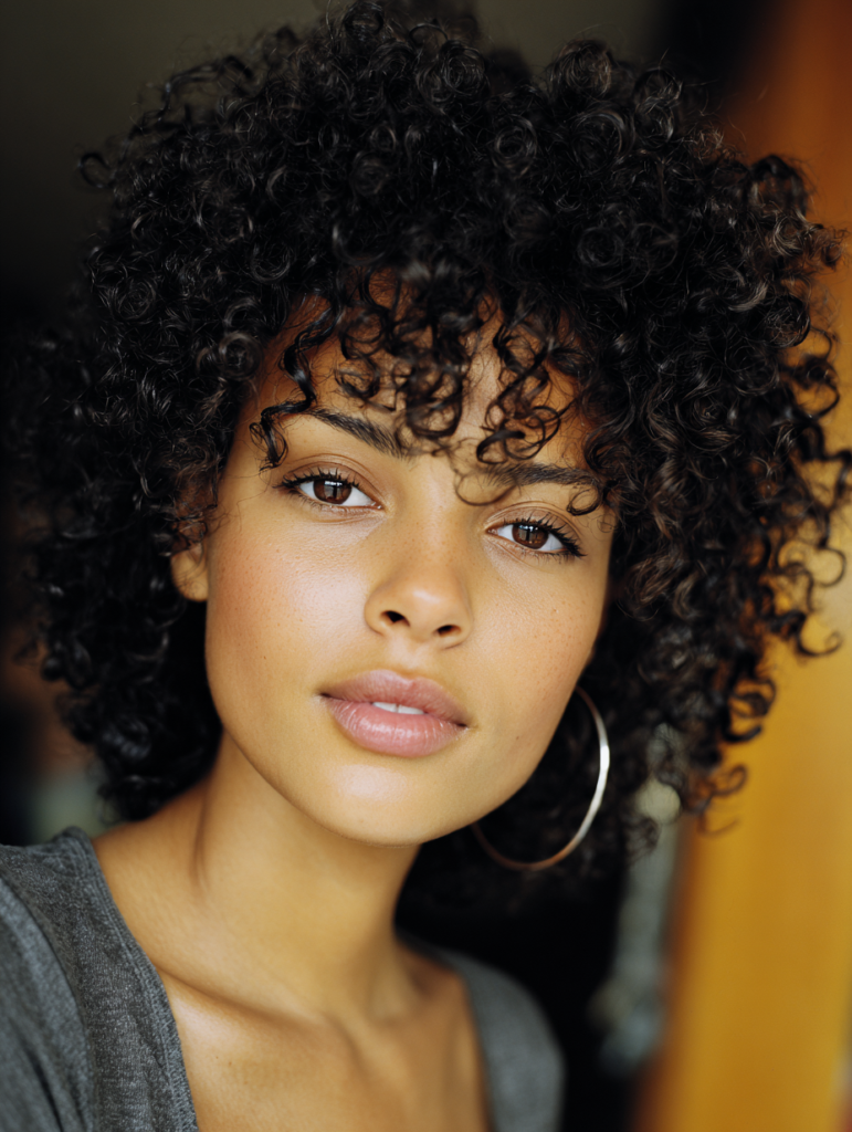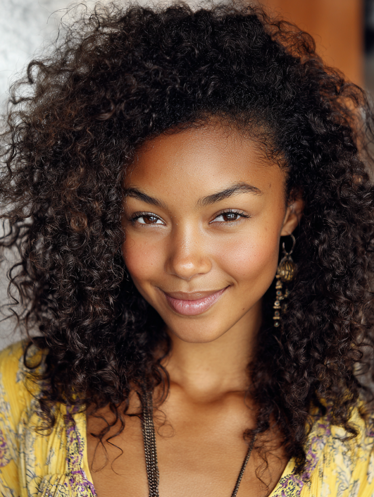 Set the curls with a diffuser and scrunch-friendly product to maintain definition. Follow your natural curl pattern when choosing the part’s placement. This approach creates a softer frame around the face and reduces bulk on one side. It suits everyday wear and special occasions.