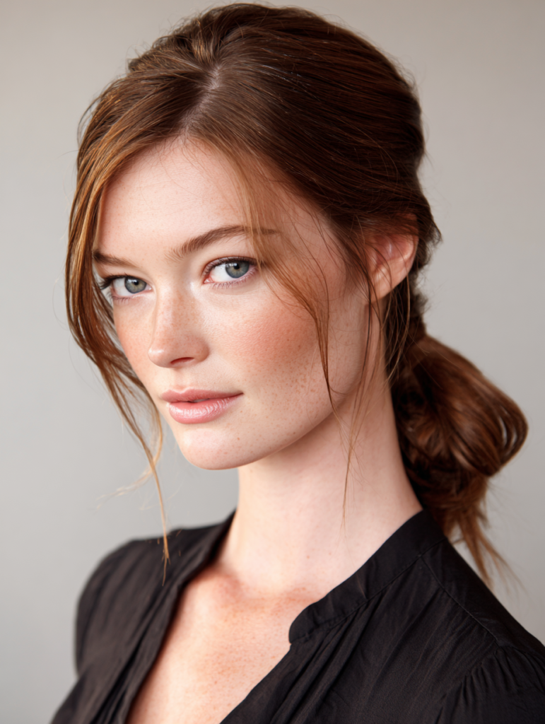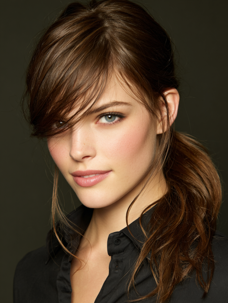 A side part low ponytail gives a simple style a more polished feel. The part directs hair toward one side, which softens the look and highlights the eyes. This style flatters many face shapes because the front pieces create a natural frame. It works best for straight, wavy, or relaxed textures that stay smooth when gathered.