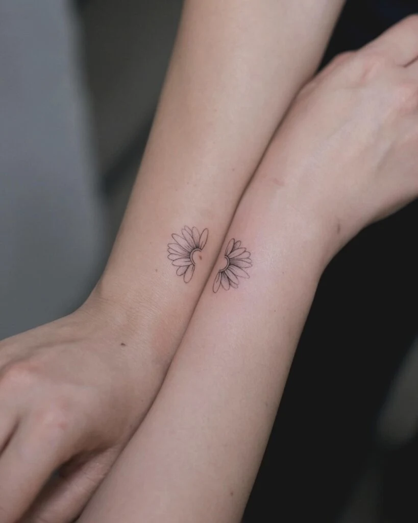 These complementary tattoos feature two halves of a daisy, each inked on a sister’s arm so they form a complete flower when placed together. At the center of the daisy is a small heart, subtly tying the design to love and affection.