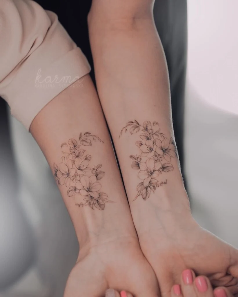 These beautifully detailed forearm tattoos feature flowing botanical designs with fine-line branches, leaves, and buds. Though not identical, the mirrored style creates a sense of harmony when the sisters stand side by side or hold hands.