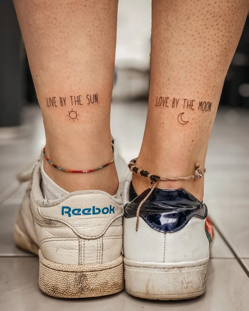 These ankle tattoos feature a poetic pairing: one reads “Live by the sun” with a small sun symbol, while the other says “Love by the moon” with a delicate crescent moon. Together, they represent balance—light and dark, energy and emotion, day and night.