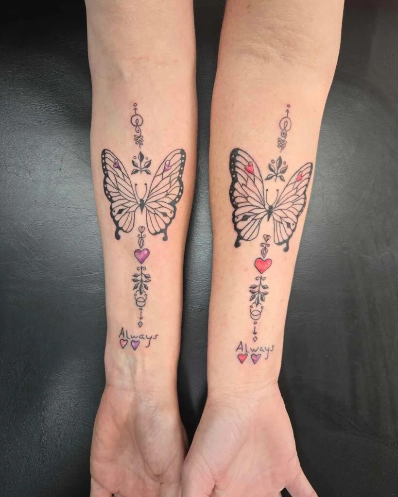 These vibrant matching forearm tattoos feature elegant butterflies surrounded by ornamental accents, with the word “Always” written below in a playful handwritten style.