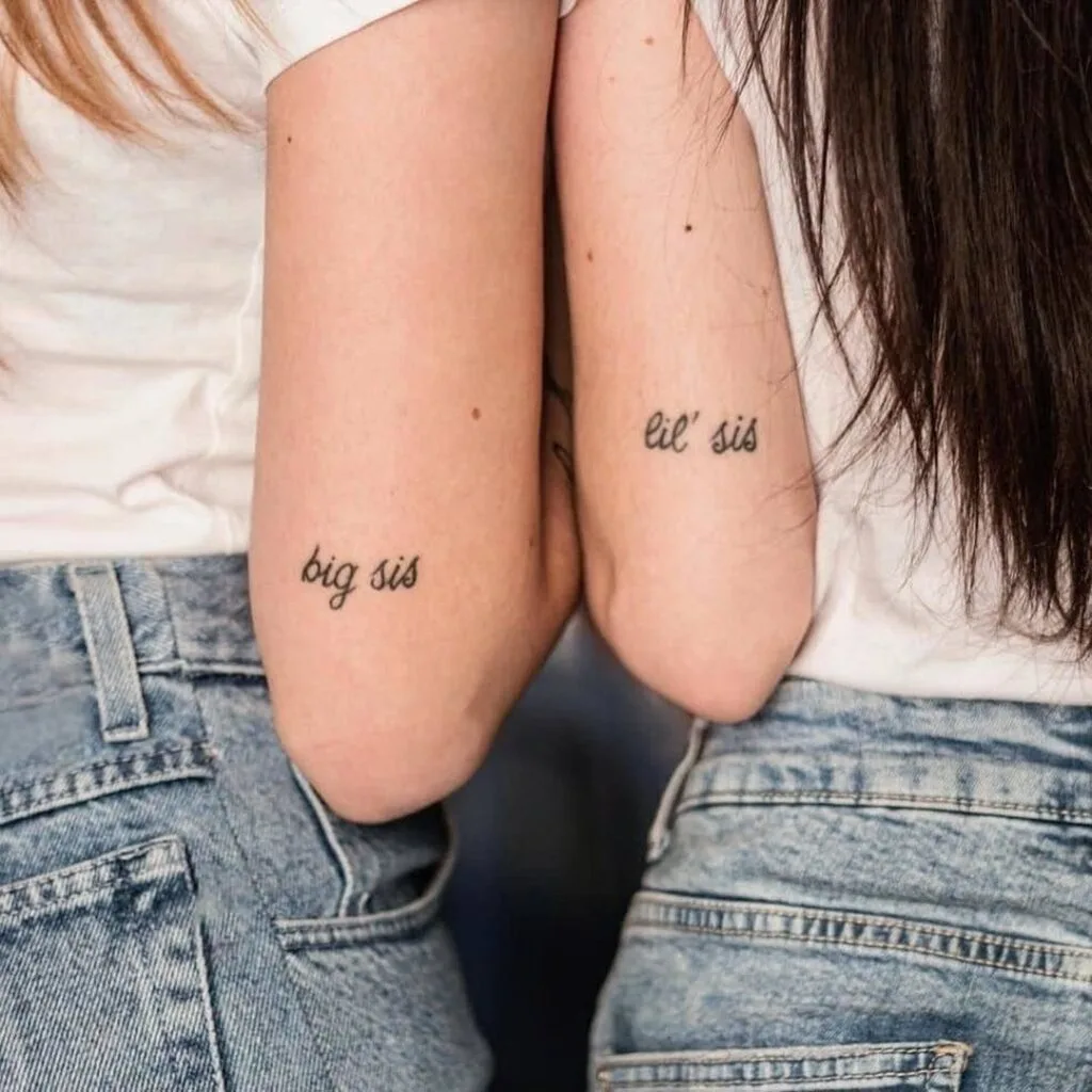 These matching tattoos clearly say it all—“big sis” and “lil’ sis” are inked in soft cursive on the backs of each sister’s arm. Simple and direct, this design celebrates the unique dynamic between older and younger siblings.