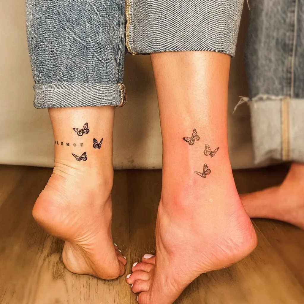 These charming ankle tattoos feature delicate black-ink butterflies in flight, symbolizing freedom, growth, and transformation. One tattoo includes the word “BALANCE” spaced neatly between the butterflies, emphasizing harmony and inner peace.