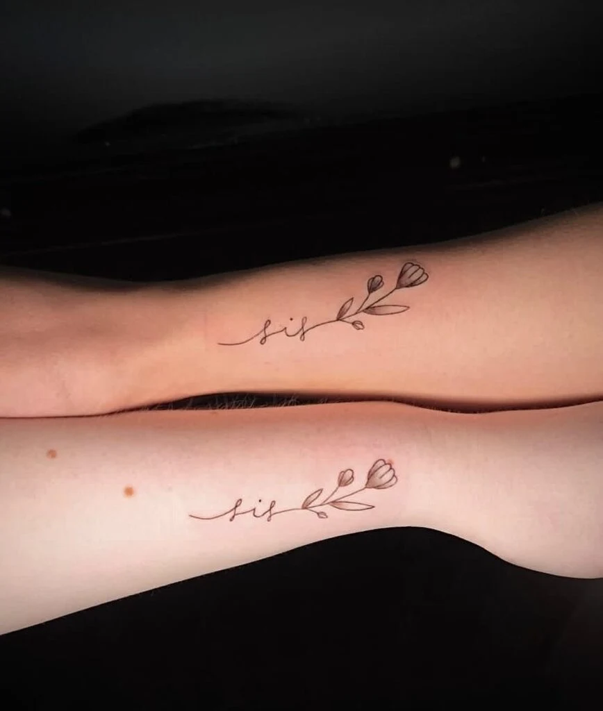 These matching tattoos feature the word “sis” written in elegant cursive, seamlessly blending into a delicate floral sprig. The simple black linework creates a graceful and timeless look, while the blooming flower adds a soft, nature-inspired touch.