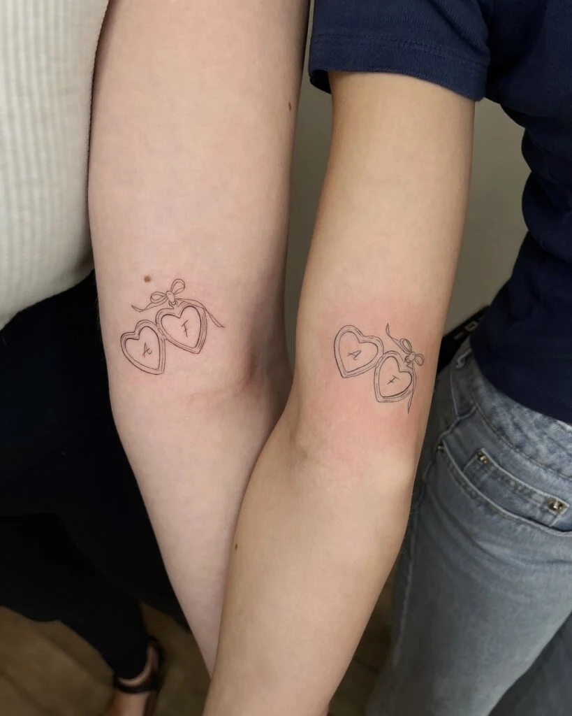 These matching tattoos feature two heart-shaped lockets tied together with a bow, each heart engraved with a different initial. The fine-line design adds a sweet and delicate touch, resembling charms from a cherished piece of jewelry.