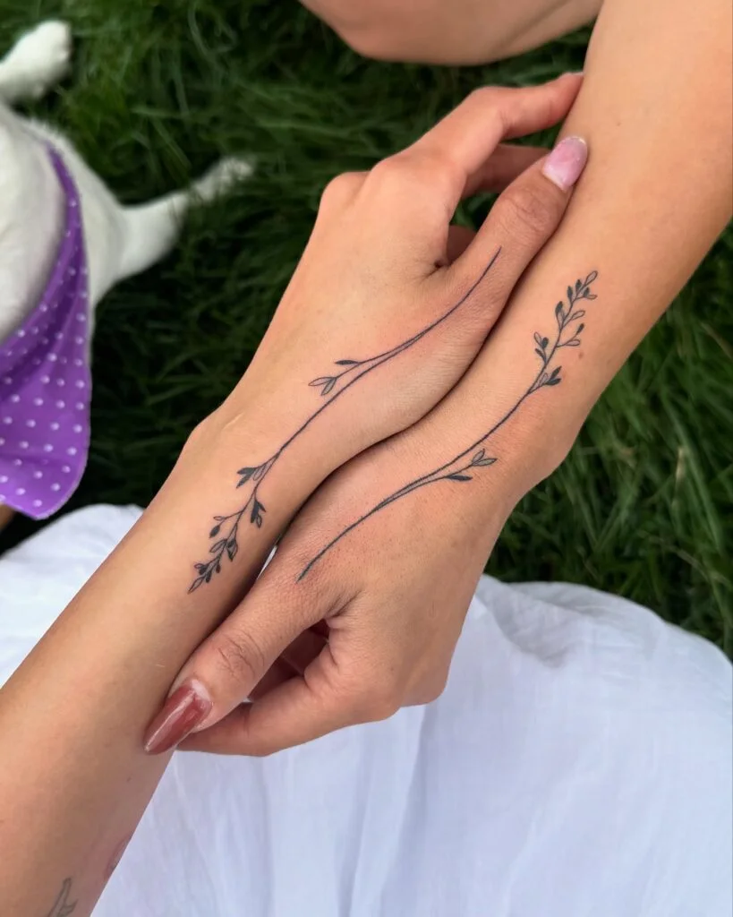 The placement enhances the organic feel, creating a visual flow when hands are held together. Simple yet meaningful, these tattoos beautifully reflect a bond that’s graceful, enduring, and deeply intertwined—like two branches from the same tree.