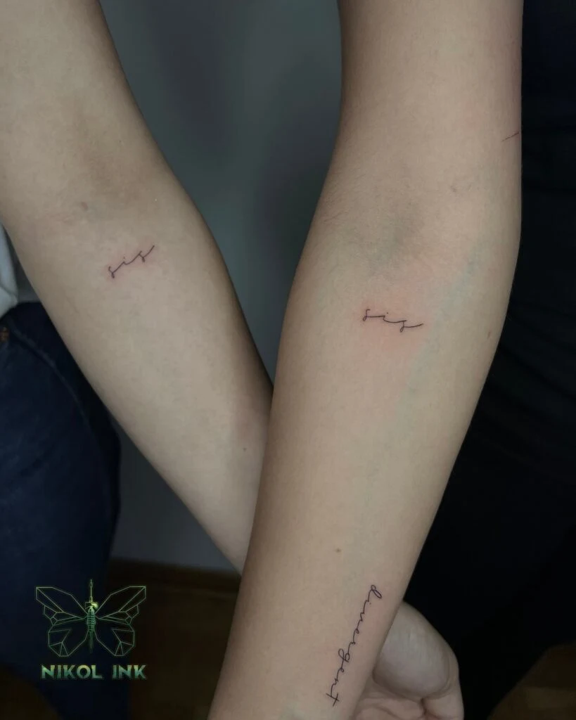 These matching tattoos feature the word “sis” in delicate, handwritten script on the inner forearms, with one design extending into the word “sisterhood.” The simplicity of the fine-line style gives the tattoos an understated elegance while still carrying deep emotional meaning.