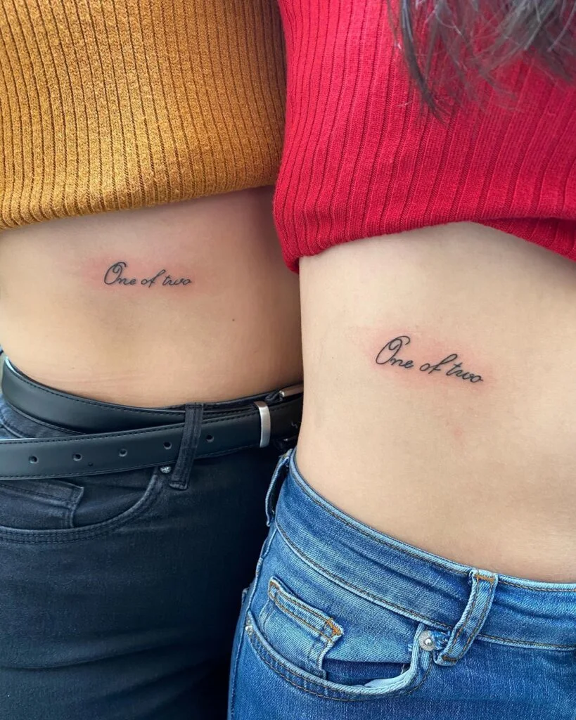 These matching side tattoos feature the phrase “One of two” in elegant cursive script, symbolizing a perfectly paired relationship—often chosen by twins or sisters who feel like mirror halves. The simplicity of the design makes a quiet yet powerful statement about belonging and identity.