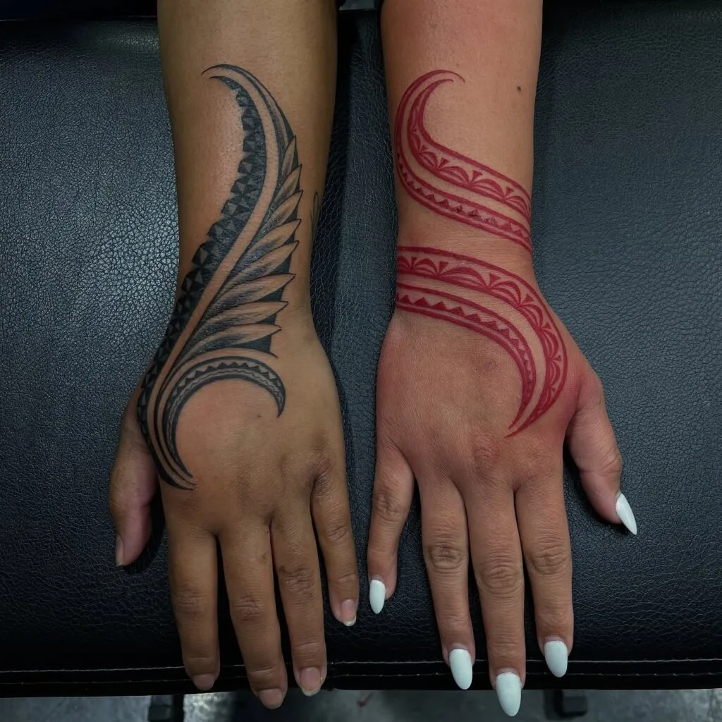 These bold and powerful sister tattoos feature distinct Polynesian-style tribal designs, one in deep black and the other in striking red ink. Each pattern flows gracefully from the wrist across the hand, showcasing traditional geometric motifs with sharp curves and layered symmetry.
