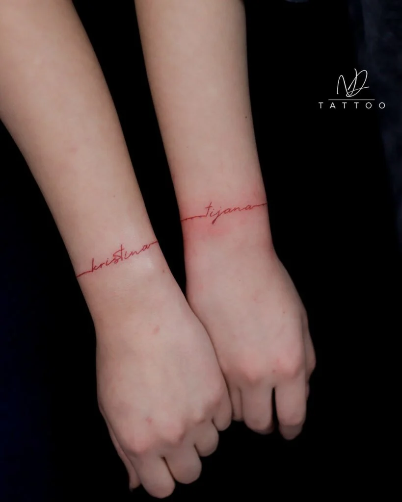 These elegant wrist tattoos feature each sister’s name written in delicate red script, forming a continuous line that wraps around the wrist. The bold red ink adds a unique and striking touch, symbolizing passion, love, and strong emotional ties.