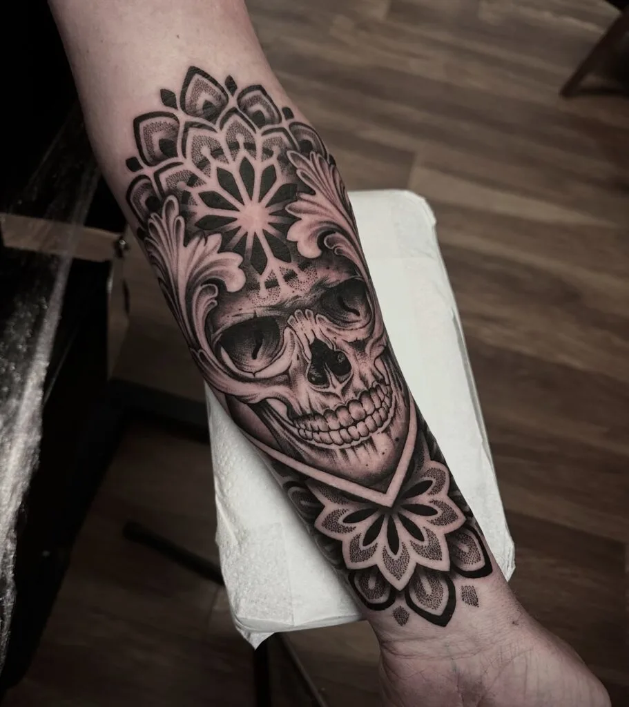 This tattoo blends a realistic skull with intricate geometric and ornamental patterns. The detailed mandala shapes flow around the skull, creating a balanced mix of symmetry and depth. Smooth shading gives the skull a lifelike quality, while the bold black lines of the geometric elements frame it beautifully.