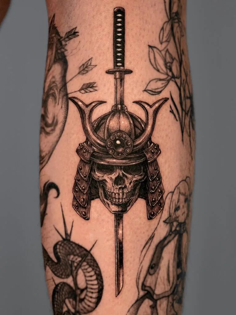 This tattoo features a skull wearing a traditional samurai helmet, pierced through by a katana blade. The detailed linework captures the metal plates, helmet curves, and sharp sword edge with precision. The skull’s grin adds intensity, symbolizing the warrior’s fearless spirit even in death.