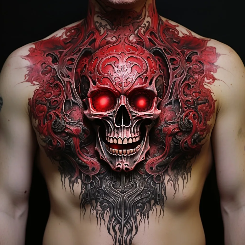 This chest tattoo showcases a fiery red skull with glowing eyes surrounded by swirling ornamental patterns. The intricate design spreads across the chest, blending organic curves and sharp edges for a dramatic effect.