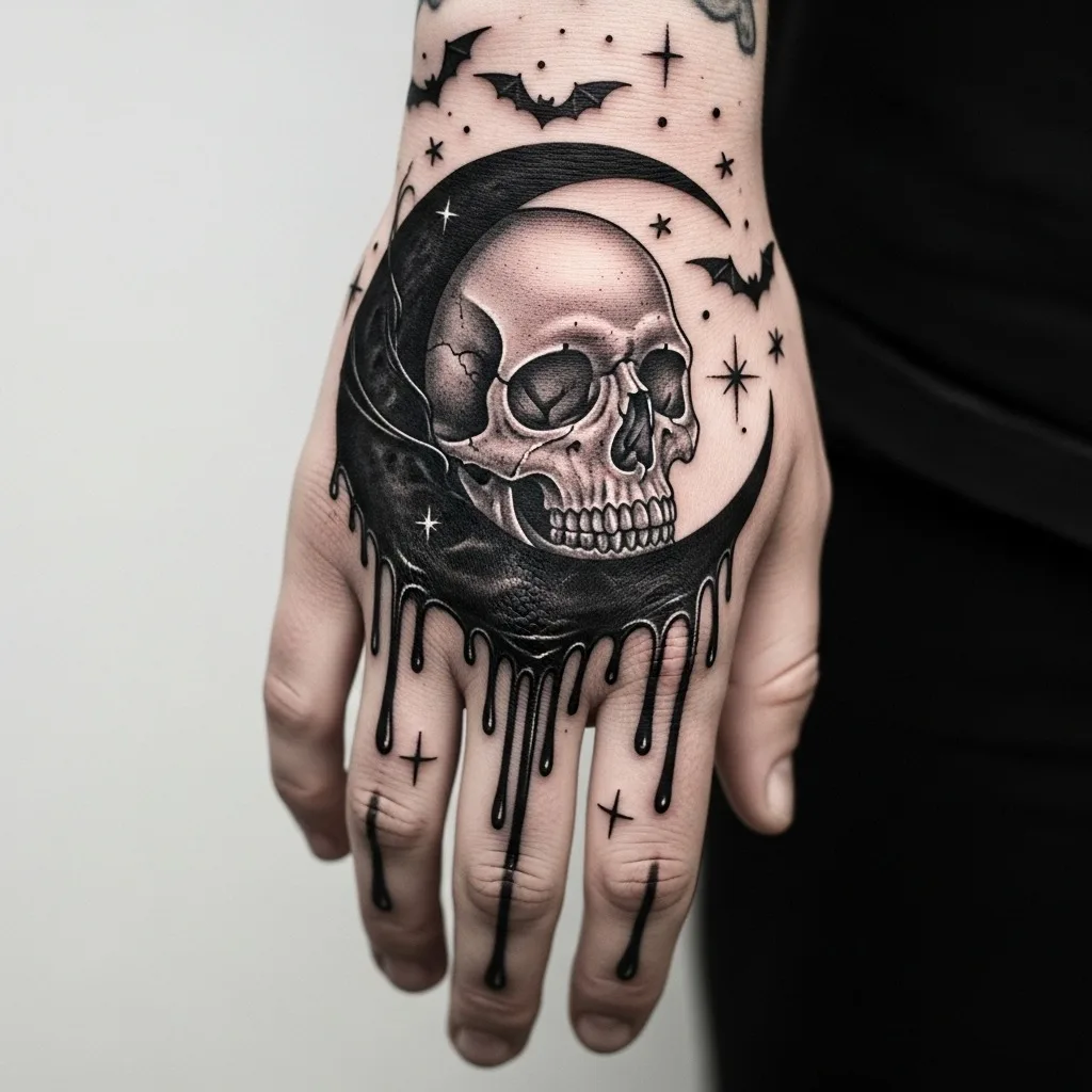 This hand tattoo shows a skull resting inside a crescent moon with dripping ink details. Tiny stars and flying bats surround the design, adding a mysterious, night-sky atmosphere. The dripping effect extends toward the fingers, giving the piece a dark, surreal touch.