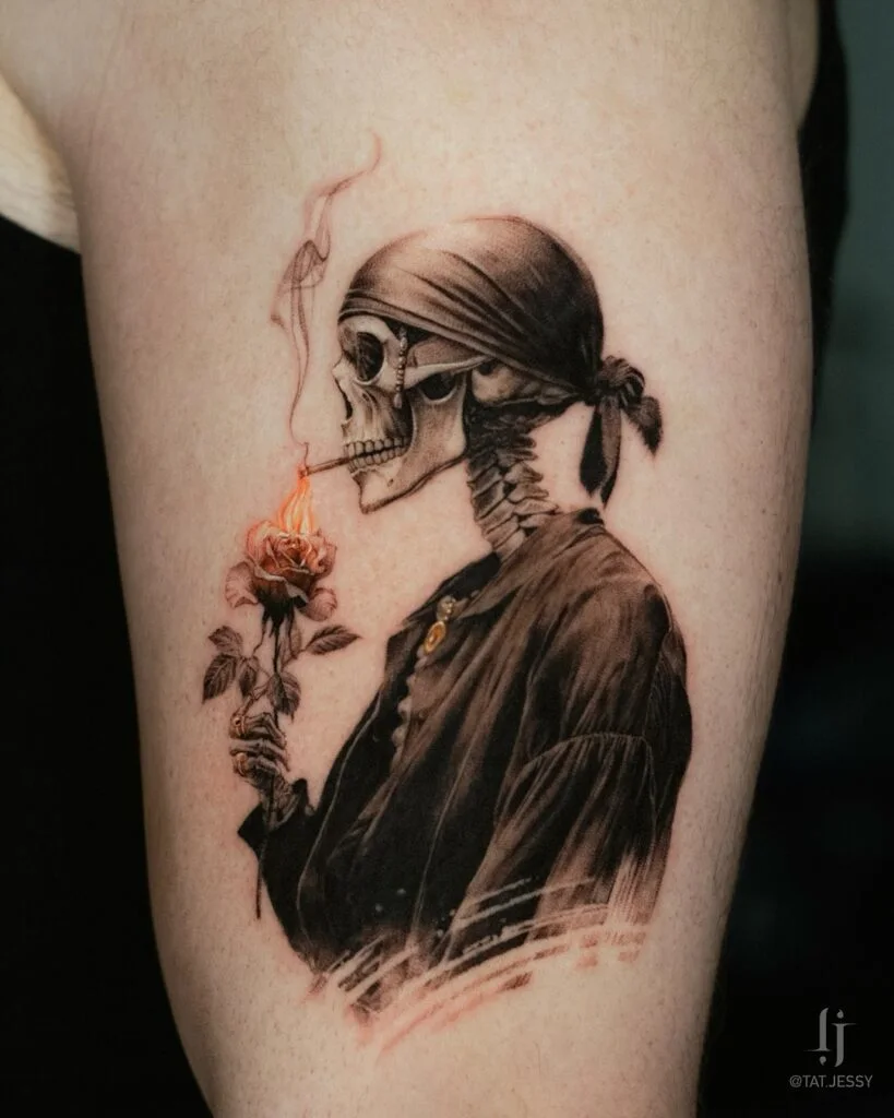 This tattoo features a skeleton dressed in dark clothing and a headscarf, holding a rose set aflame. The skeleton’s calm pose contrasts with the fiery bloom, creating a mix of serenity and intensity. Subtle orange and red tones highlight the rose, standing out against the grayscale shading of the rest of the piece.