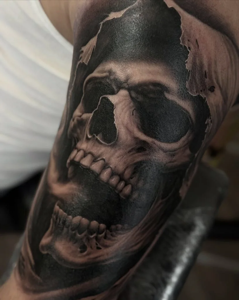 Torn and smoky textures frame the design, adding movement and atmosphere. The dark background enhances the bone structure, emphasizing the hollow eyes and grinning teeth. Placed on the shoulder, it commands attention and captures both realism and darkness in a single, powerful image.