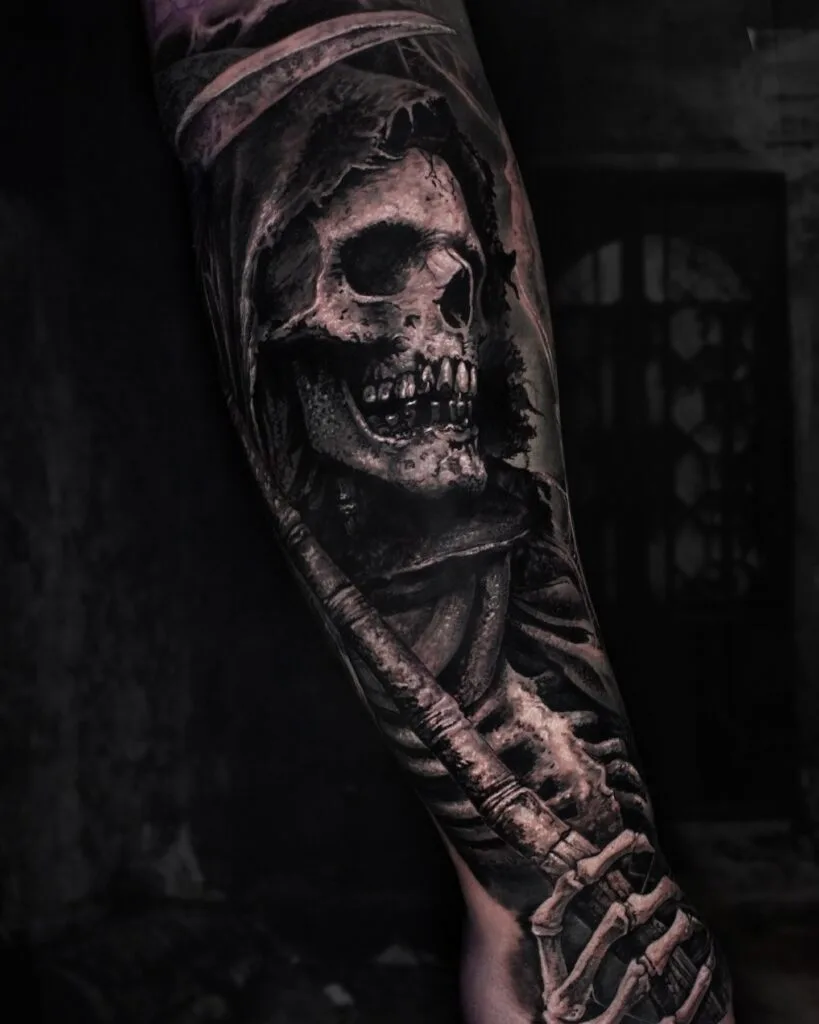 This tattoo depicts the Grim Reaper with a detailed skull face and tattered hood, holding his scythe. The artist used deep blacks and subtle highlights to create striking contrast, giving the design a hauntingly realistic depth.
