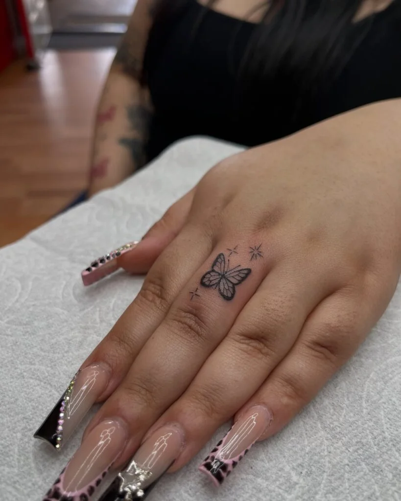 This charming tattoo features a small butterfly surrounded by twinkling sparkles, delicately placed on the middle finger. The butterfly is a timeless symbol of transformation and beauty, while the stars add a dreamy, whimsical touch.
